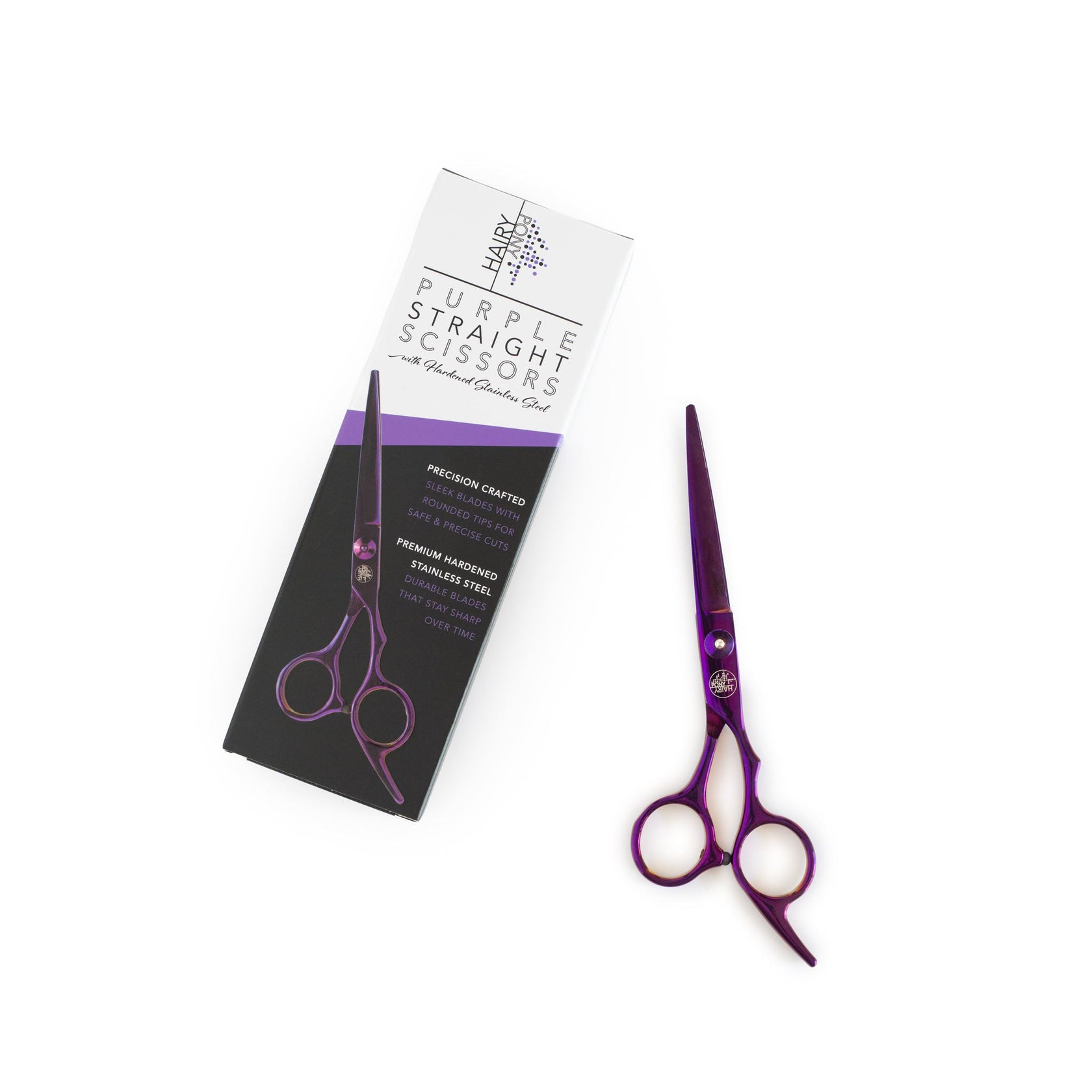 Add some colour to your grooming kit with the HAIRY PONY HORSE STRAIGHT SCISSORS - PURPLE! Precision crafted featuring sleek blades with blunt tips, the HAIRY PONY HORSE STRAIGHT SCISSORS - PURPLE ensure safe & precise cuts every time. Premium hardened stainless steel blades not only guarantee durability but also retain their sharpness over time, making them a reliable tool in your grooming kit.