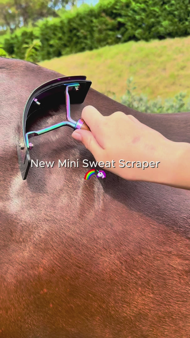 A smaller, vibrant take on our popular Luxury Gold Sweat Scraper, this mini version is perfect for little hands, ponies, or anyone who loves a pop of colour. Featuring a striking holographic rainbow finish on the metal, it stands out in the wash bay and makes grooming even more fun – kids will love it!