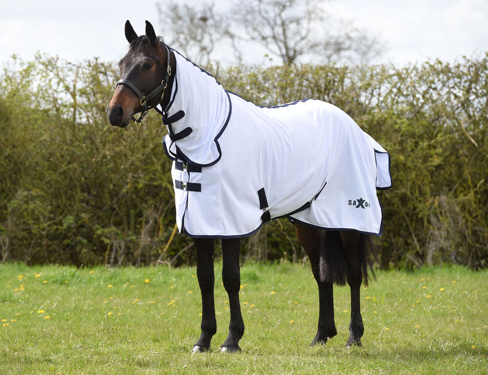 The Saxon Mesh Combo Neck fly sheet has a fine weave mesh outer to offer insect and UV protection while keeping your horse cool during the summer months. This Saxon fly rug with neck cover that has two touch tape closures and features a twin surcingle front closure, twin low cross surcingles, tail flap and tail cord.
